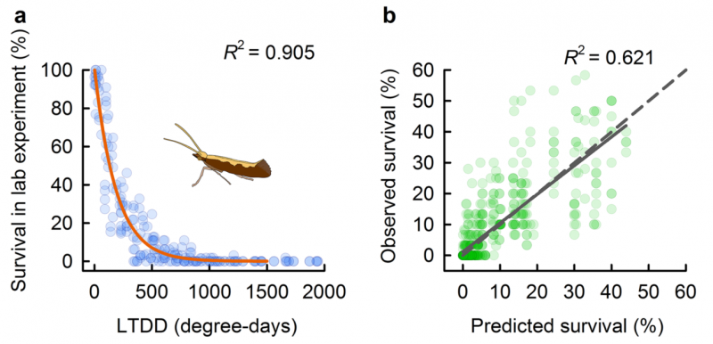 為了更好地精確預(yù)測(cè)分析氣候問(wèn)題下小菜蛾的過(guò)冬范疇,科學(xué)研究團(tuán)體根據(jù)房間內(nèi)仿真模擬和田里認(rèn)證,分析出牽制小菜蛾過(guò)冬的重要?dú)夂蛞蜃?,即超低溫積溫日度(冬天日均溫11°C下列的積溫),并搭建出超低溫日度實(shí)體模型。馬春森詳細(xì)介紹,“大自然繁雜天氣條件下,超低溫日度實(shí)體模型能表述62.1%的成活率,這遠(yuǎn)遠(yuǎn)地高于之前的超低溫生存實(shí)體模型。那么高的精確度,主要是該實(shí)體模型精確地模仿了決策小菜蛾超低溫身亡的全過(guò)程,即長(zhǎng)期性超低溫?fù)p害,而不是在非常低氣溫下受凍。此外,超低溫積溫日度這一氣候因子非常容易從以前的氣侯數(shù)據(jù)信息和以后的場(chǎng)景中得到。”在我國(guó)河南是小菜蛾過(guò)冬的“邊沿”地區(qū)。過(guò)去50年里,氣候問(wèn)題使全世界小菜蛾的過(guò)冬遍布總面積增加了2四十萬(wàn)平方千米;將來(lái)平均溫度每升高1℃,將造成 過(guò)冬遍布擴(kuò)張約2二十萬(wàn)平方千米。