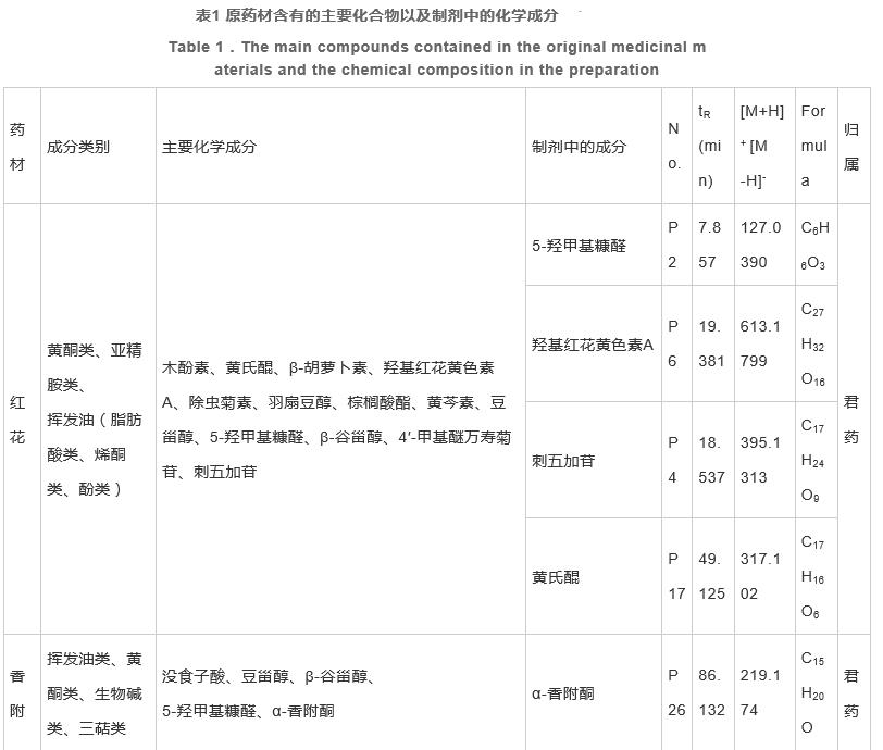 本研究組根據(jù)HPLC-QTOF-MS/MS評定舒筋活絡(luò)膠襄的成分。根據(jù)Scifinder數(shù)據(jù)庫查詢及有關(guān)文獻(xiàn)資料,創(chuàng)建舒筋活絡(luò)膠襄中常含成分的化學(xué)名稱、化學(xué)式、相對性分子質(zhì)量及一級殘片等信息內(nèi)容數(shù)據(jù)庫查詢。運(yùn)用Peakview手機(jī)軟件,依據(jù)一級質(zhì)譜分析、二級質(zhì)譜分析及裂化規(guī)律性共評定了舒筋活絡(luò)膠襄中2七個(gè)化學(xué)物質(zhì),關(guān)鍵包含酚酸類、木質(zhì)纖維素類、黃酮類化合物、多糖類及苯丙素類物質(zhì)。舒筋活絡(luò)膠襄的(-)ESI-MS和( )ESI-MS的質(zhì)譜分析總離子流圖見圖1。原中藥材中包含的有機(jī)化合物有2七個(gè)能夠 “傳送”到中藥制劑中,實(shí)際信息內(nèi)容見表1所顯示。