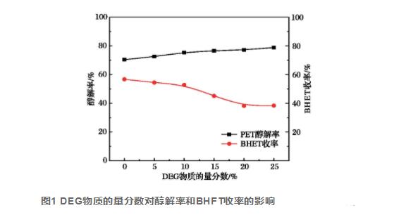 從圖1由此可見:伴隨著DEG摩爾質(zhì)量成績(jī)從0提升至25%,醇解率由70%擴(kuò)大至80%,表明在相同條件下擴(kuò)大DEG成分能加速醇解速度;BHET產(chǎn)出率則從55%降到40%。這是由于伴隨著DEG與PET反映的開展,除開轉(zhuǎn)化成BHET外,還產(chǎn)生了: