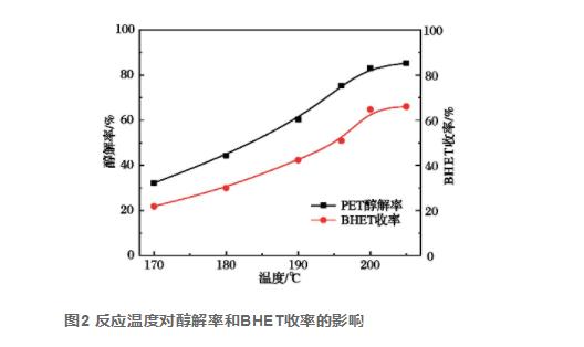 自然壓下EG的熔點(diǎn)為196℃,本實(shí)驗(yàn)中因?yàn)榧尤肓薉EG能提升 醇解劑的熔點(diǎn),使反映溫度在自然壓下會(huì)做到205℃上下,因此在170~205℃范疇對(duì)PET醇解反映開展實(shí)驗(yàn)。由圖2得知,伴隨著氣溫的上升,PET醇解率從32%擴(kuò)大至85%,BHET成品率從22%擴(kuò)大至66%。這主要是因?yàn)檩^高的氣溫能夠 加速分子熱運(yùn)動(dòng),使醇解速度變快。在反映溫度做到200℃后,醇解率和BHET成品率保持穩(wěn)定,各自做到83%和65%。