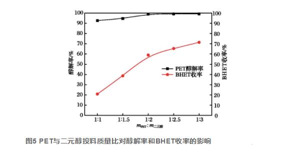 由圖5得知,在選定的PET與二元醇質量比范疇內,PET的醇解率都到達了90%之上,當mPET∶m二元醇為1∶2時,PET的醇聚率貼近100%,BHET成品率為60%;再次增加二元醇加料比,BHET的成品率再次擴大,做到75%。這是由于伴隨著二元醇的占比擴大,與PET的了解更充足,醇解反應速率加速,反映水平更為完全,BHET產出率也隨著擴大,因此 mPET:m二元醇在1∶2~1∶3范疇較為適合。
