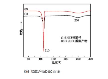 圖6為醇解物質的DSC曲線圖,在其中曲線圖(1)為選購的BHET規(guī)范試品,曲線圖(2)為EG/DEG與PET的醇解物質。由圖6由此可見,兩試品曲線圖均在110℃上有銳利的吸熱反應峰,在250℃上下有廣闊的吸熱反應峰。依據PINGALE的畢業(yè)論文報導,110℃處為BHET的熔化吸熱反應峰,而在250℃處則是提溫歷程中BHET產生加聚反應所造成的EG蒸發(fā)吸熱,進而建立了熔域開闊的吸熱反應峰。