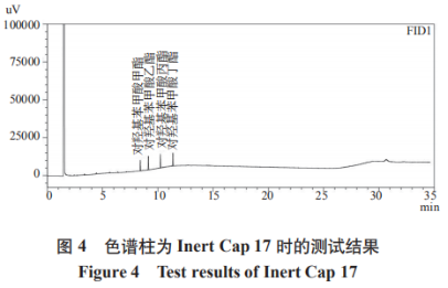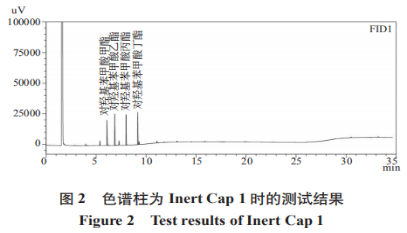 對(duì)甲基苯甲醛脂類具備酚羥基構(gòu)造,因而本試驗(yàn)挑選 InertCap1,InertCap5,InertCap1301,InertCap17與InertCapWAX在柱溫箱為100℃,標(biāo)液濃度值均為50μg/mL的標(biāo)準(zhǔn)下實(shí)現(xiàn)檢測(cè),結(jié)果譜圖如2~6。