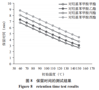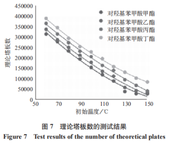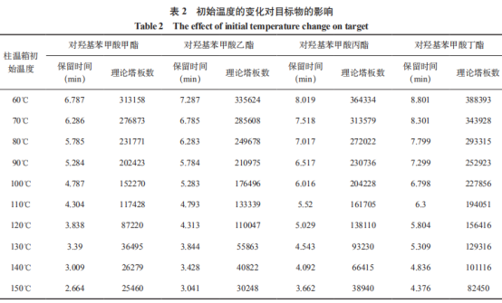 依據(jù)以上,制做數(shù)據(jù)圖如圖所示7、圖8。根據(jù)圖7與圖8能夠 看得出,伴隨著原始溫度的上升,總體目標物的出峰時間就越提早,而理論塔板數(shù)卻越小。從經(jīng)濟成本考慮到,保存期越小,那麼剖析經(jīng)濟成本就越小,可是從表2得知,當原始溫度很多100℃的情況下,總體目標物的理論塔板數(shù)均低于200000,與此同時原始溫度超過80℃時,總體目標物的保存期相距并不算太大,因而為了能確保總體目標物的敏感度,故本科學研究挑選 最好的原始溫度為90℃。