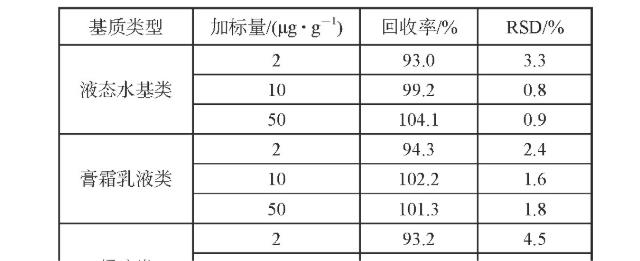 將規(guī)范貯備水溶液以適度性加上到液態(tài)水基類、膏霜保濕乳液類、疑膠類空缺栽培基質(zhì)中,按本方式 開展前解決和檢驗。頻率穩(wěn)定度(S/N)為3時,獲得方式 的方法檢出限為0.3μg/g,可達到檢驗要求。