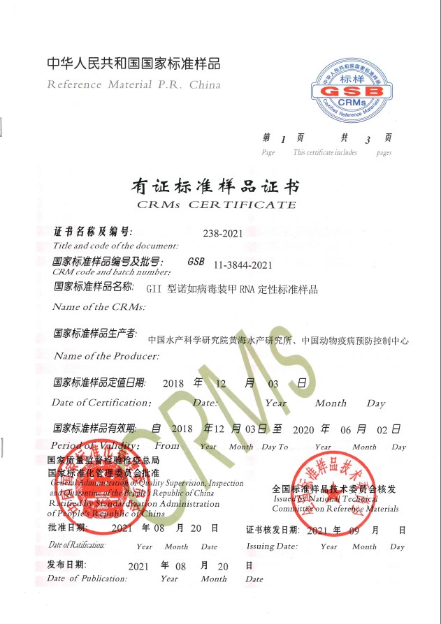 近日,國家市場監(jiān)管質(zhì)監(jiān)總局、我國規(guī)范化管理聯(lián)合會協(xié)同公布國家行業(yè)標準公示(2021年第16號)。中國水產(chǎn)科學(xué)院江海水產(chǎn)品研究室海產(chǎn)品品質(zhì)與安全性調(diào)研室姚琳副研究員帶頭研制的“GII型諾如病毒盔甲RNA判定規(guī)范試品”(國家行業(yè)標準試品序號:GSB 11-3844-2021)宣布得到 準許、公布。