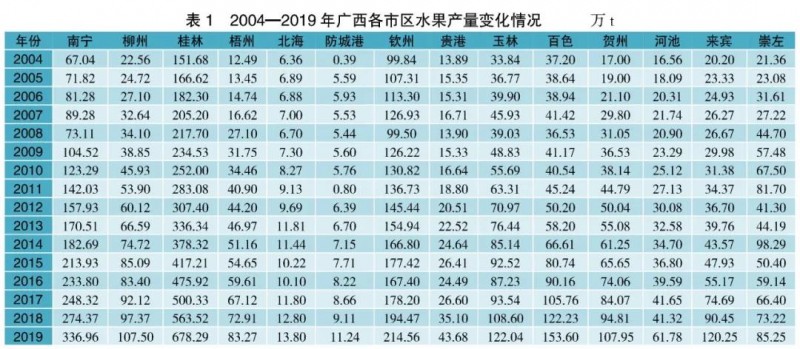 由2004—2019年廣西省各市縣新鮮水果生產(chǎn)量轉(zhuǎn)變狀況(表1)得知,廣西水果栽種生產(chǎn)制造遍布比較集中化,關鍵遍布在桂林市、南寧市、欽州市,2019年3個市新鮮水果生產(chǎn)量各自為678.29萬、336.96萬、214.56萬t,各自占我區(qū)新鮮水果總產(chǎn)值的31.69%、15.75%和10.03%,超出廣西水果總產(chǎn)值的一半。次之為百色市、欽州、賓客、廣西賀州、柳州市,5個市新鮮水果生產(chǎn)量之和占我區(qū)新鮮水果總產(chǎn)值的28.57%。蔬菜種植遍布較少的為北海市、廣西防城港市,2019年新鮮水果生產(chǎn)量各自為13.80萬、11.24萬t。
