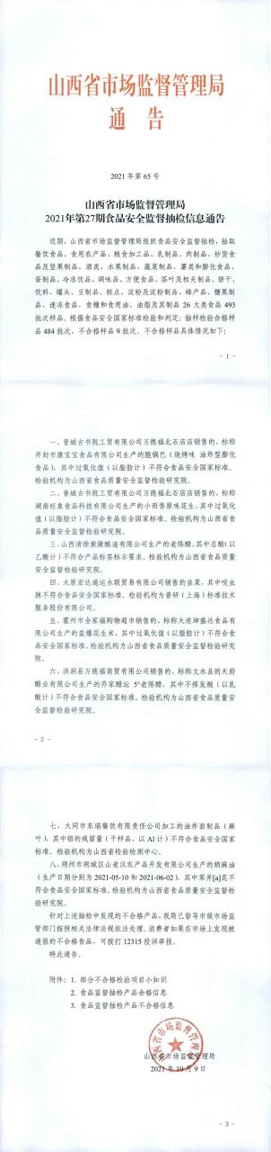 陜西省銷售市場監(jiān)督管理局2021年第27期食品衛(wèi)生安全監(jiān)管抽查信息內(nèi)容通知