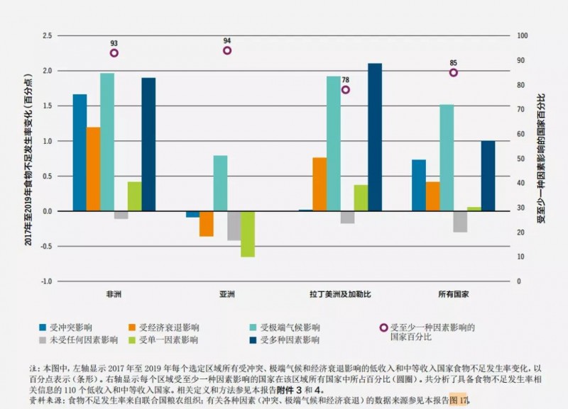 南美洲及加勒比是2017至2019年間受各種要素干擾造成 食材不夠發(fā)病率漲幅較大的地區(qū),而非州是唯一一個(gè)與此同時(shí)受三種要素干擾造成 食材不夠發(fā)病率升高的地區(qū)。聯(lián)合國(guó)糧農(nóng)組織