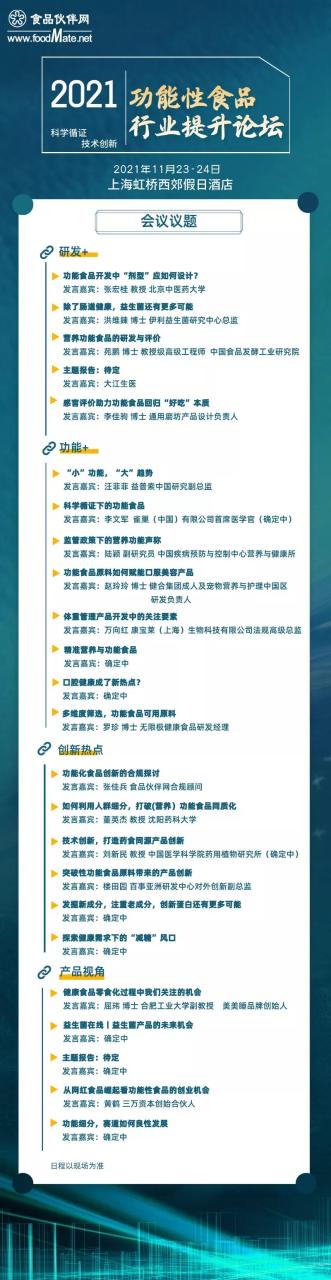 在這里情況下,由食用添加劑網(wǎng)承辦的“2021功能食品領(lǐng)域提高社區(qū)論壇”將于11月23-24日在上海虹橋站南郊假日酒店舉行。此次社區(qū)論壇將以“科學(xué)研究循證,技術(shù)革新”為主題風(fēng)格,一同討論功能食品領(lǐng)域最前沿科學(xué)研究,領(lǐng)域政策法規(guī),自主創(chuàng)新技術(shù)性,構(gòu)建一個(gè)領(lǐng)域內(nèi)隨意溝通交流、信息內(nèi)容共享、協(xié)作的服務(wù)平臺(tái),推動(dòng)功能食品領(lǐng)域的良好發(fā)展趨勢(shì)。