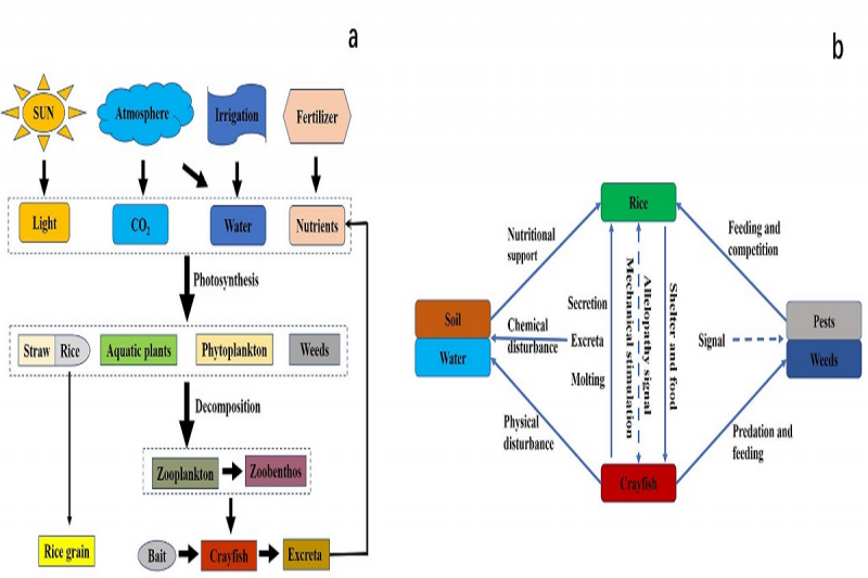 Chinese agriculture is seeking a sustainable production increase in order to solve the food problem for its population. The traditional “high input, high pollution” agricultural production mode has led to a large burden on resources and on the environment. At present, China is promoting the transformation of its agricultural production modes in the direction of resource conservation and green development. In recent years, the crayfish-rice integrated system of production (CRISP) has been developed intensively in China due to its important economic benefits. evaluating this new agricultural model comprehensively and guiding the related green sustainable development are urgent issues. Here we used statistical data and literature to review the origin and development of CRISP in China and to compare the Chinese CRISP with similar models in other parts of the world. We reviewed studies on the ecological and social effects of CRISP for its objective evaluation and drew three main findings. First, although the crayfish initially introduced were sourced from the United States, the extensive application of CRISP led China to rapidly become the largest crayfish producer worldwide — accounting for over 90% of the crayfish production — and a leader in crayfish processing and catering industries. Second, the specific Chinese CRISP culture model promotes a green transformation towards a high-quality rice production system. Finally, CRISP affected positively soil quality, water and nutrient recycling, pest limitation and biodiversity development in the paddy field system. CRISP reveals a good example of effective application of green revolution in China\’s agricultural production. We analyse for the first time the specific ecological foundation and management model for the sustainable development of CRISP. These observations provide reference for the development of other agriculture–livestock integrated systems worldwide.