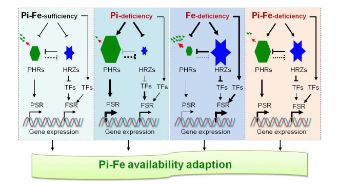 科學(xué)研究精英團(tuán)隊(duì)研究發(fā)現(xiàn),磷營養(yǎng)物質(zhì)數(shù)據(jù)信號核心管控因素(PHRs)和鐵營養(yǎng)物質(zhì)數(shù)據(jù)信號關(guān)鍵管控因素(HRZs)一同受體了磷-鐵數(shù)據(jù)信號的互作全過程。PHRs和HRZs根據(jù)互相抑止管控分別的蛋白質(zhì)和基因表達(dá)水準(zhǔn),為此來管控中下游磷挨餓回應(yīng)遺傳基因和鐵挨餓回應(yīng)基因表達(dá),進(jìn)而解決土壤層不一樣的磷-鐵營養(yǎng)物質(zhì)供貨轉(zhuǎn)變,以確保農(nóng)作物的成長要求。進(jìn)一步研究發(fā)現(xiàn),PHRs-HRZs構(gòu)成分子結(jié)構(gòu)管控控制模塊在方式綠色植物擬南芥中也是普遍存在的,從而推斷這類互相抑止的分子結(jié)構(gòu)控制模塊很有可能在綠植中普遍現(xiàn)象。該分析為根據(jù)分子結(jié)構(gòu)繁育的方法處理在我國黃紅壤農(nóng)用地磷-鐵營養(yǎng)物質(zhì)不平衡難題帶來了新理念。