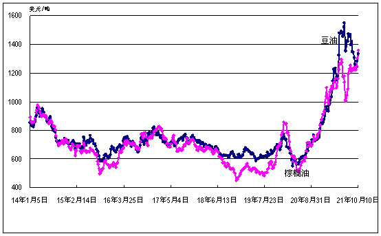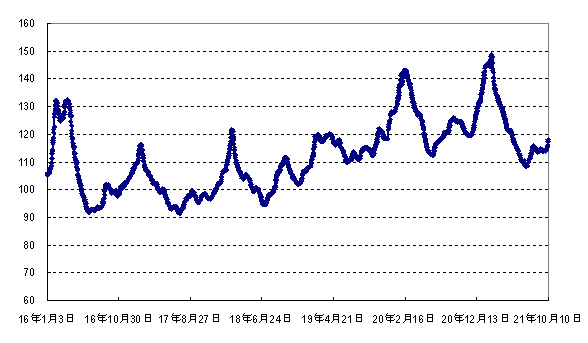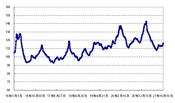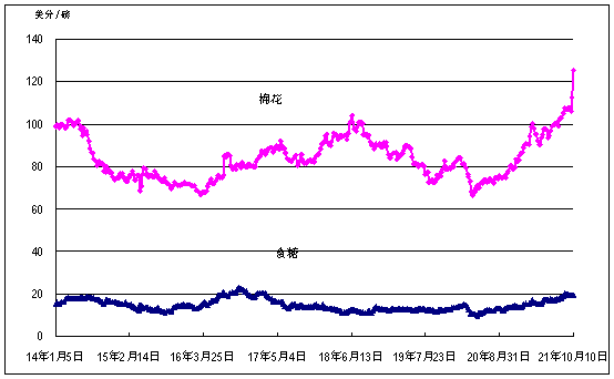 國(guó)際性棉絮指數(shù)值(SM級(jí))每磅125.4便士(一噸2765美元),同比漲11%,同期相比高六8%;新加坡食用油荷蘭鹿特丹港到岸周平均價(jià)一噸1357美元,同比漲4%,同期相比高84%;英國(guó)芝加哥商品交易所大豆油和麥子近期期權(quán)合約收市周平均價(jià)一噸各自為1335美元和274美元,同比各自漲4%和3%,同期相比各自高84%和32%。