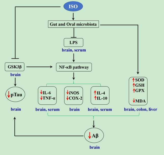 綜合性全部實驗結果,基本推斷異葒草素緩解老年性癡呆病有關病理學指標值的原理為:經過調整口腔內部和腸道微生物有益菌構造,減少血清蛋白和腦部中LPS的成分,從而抑止LPS誘發(fā)的NF-κB發(fā)炎通道,最后根據腦-腸軸來調整并緩解老年性癡呆病有關病理學指標值。