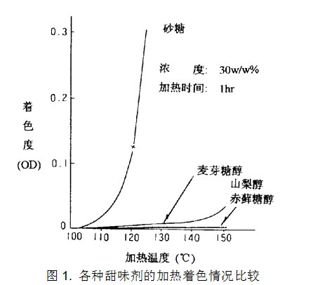 赤蘚糖醇熔點(diǎn)為126℃,沸點(diǎn)329~331℃,對酸熱十分穩(wěn)定。在一般食品加工條件下,幾乎不會(huì)出現(xiàn)褐變或分解現(xiàn)象,能忍耐硬糖生產(chǎn)時(shí)的高溫熬煮步驟而不褐變。圖1顯示了加熱著色試驗(yàn)結(jié)果。