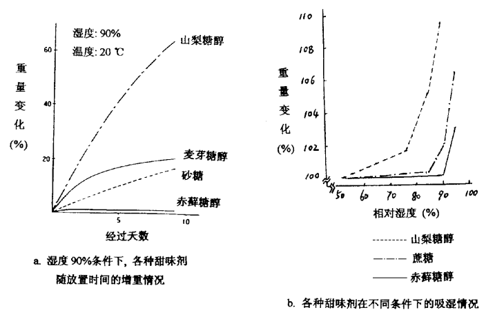 赤蘚糖醇結(jié)晶性好,吸濕性低,易于粉碎制得粉狀產(chǎn)品。在相對濕度90%的環(huán)境中也不吸濕,比蔗糖更難吸濕(圖2)。用粉狀體時(shí),操作工序同砂糖。