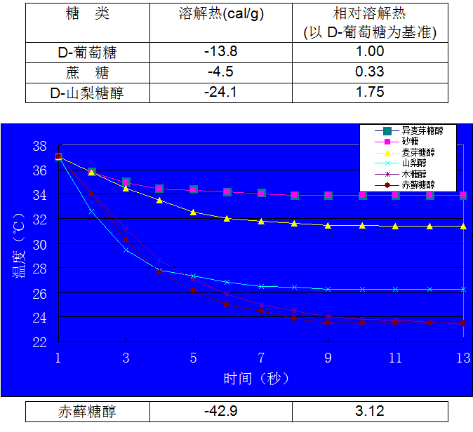 赤蘚糖醇對水的溶解熱度為葡萄糖的3倍,山梨糖醇的1.8倍,(表2),即使與糖混合使用,溶解吸熱也大,故可制造有清涼感的食品。