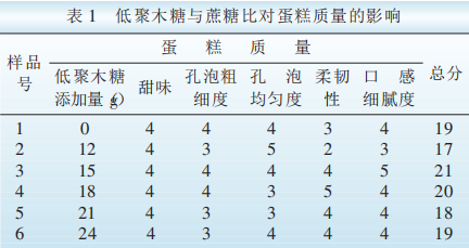 由表1可知,低聚木糖的用量為15g時(shí),蛋糕的甜味較適當(dāng),孔泡粗細(xì)均勻,柔韌性好,口感細(xì)膩、無粗糙感,如再增加低聚木糖的用量,則蛋糕的品質(zhì)有所降低,故低聚木糖用量為15g時(shí)效果佳。