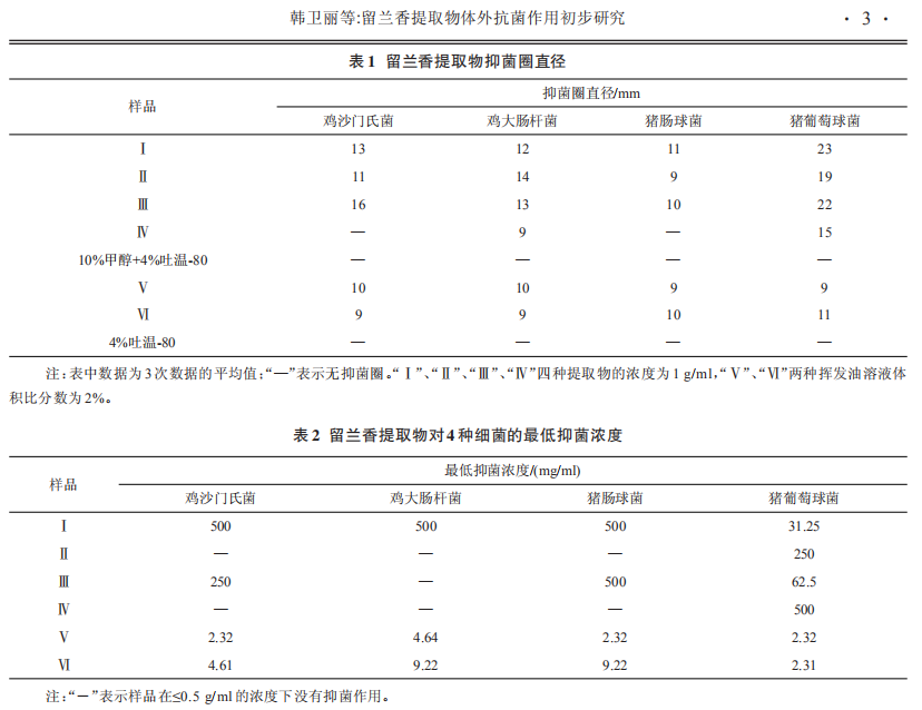 留蘭香醇提物Ⅲ抑菌效果尚可,對(duì)3種細(xì)菌均有不同程度的抑制作用,對(duì)豬葡萄球菌抑菌作用較強(qiáng)