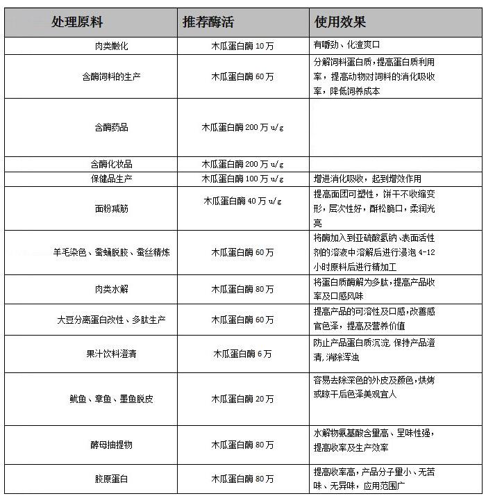 利用木瓜蛋白酶的酶促反應(yīng),可把食品中大分子的蛋白質(zhì)水解成易于吸收的小分子肽或氨基酸,廣泛適用于如:雞、豬、牛、海產(chǎn)品、血制品、大豆、花生等動植物蛋白酶解、肉類嫩化劑、酒類澄清劑、餅干松化劑、面條穩(wěn)定劑、保健食品、醬油釀造及酒類發(fā)酵劑等,即可提高食品的營養(yǎng)價值,又可降低成本。