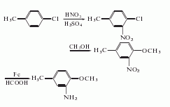 1.由對氯甲苯硝化、甲氧基化、還原而得。在15-20℃將混酸加入對氯甲苯中,在30℃攪拌2h,用水稀釋,分離廢酸,水洗得4-氯-3-硝基甲苯(收率30.6%)和4-氯-2-硝基甲苯(收率56.7%),用分餾和結晶法將兩者分離,得4-氯-3-硝基甲苯。將其與甲醇及甲醇鈉溶液反應,用硫酸中和分離,得3-硝基-4-甲氧基甲苯,收率85.6%。用水、鐵粉、甲酸還原后,再用溶劑汽油多次萃取蒸餾而得。