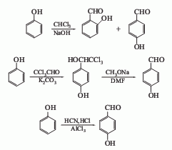 1.對羥基苯甲醛的生產(chǎn)有多條工藝路線,目前工業(yè)生產(chǎn)主要有苯酚、對甲酚、對硝基甲苯等原料路線。1.苯酚法苯酚法又分為Reimer-Tiemann反應(yīng)、Gattermann反應(yīng)、苯酚-三氯乙醛路線、苯酚-乙醛酸路線、苯酚-甲醛路線等多種合成工藝路線。苯酚法的工藝特點是原料易得,制造工藝較簡單,但收率偏低,成本較高。(1)Reimer-Tiemann反應(yīng)苯酚和三氯甲烷在堿水溶液中,于60-100℃下加熱反應(yīng)2-4h,同時生成對羥基苯甲醛和鄰羥基苯甲醛(俗稱水楊醛),總收率50%左右,對羥基苯甲醛收率最高僅17%。此工藝主要用來合成水楊醛,對羥基苯甲醛作為副產(chǎn)品,但卻是現(xiàn)有的主要工藝生產(chǎn)方法之一。此工藝原料轉(zhuǎn)化率和產(chǎn)品收率都很低,還有大量焦油產(chǎn)生。氯仿必需過量,未反應(yīng)的苯酚不易回收,產(chǎn)品的分離和提純困難。因此,必須大力開發(fā)新的高效催化劑,提高反應(yīng)的選擇性,開發(fā)簡單高效的產(chǎn)品分離和提純方法,才能降低成本,提高產(chǎn)品得率。(2)Gattermann反應(yīng)苯酚和HCN,在AlCl3存在下,通入干HCl,進(jìn)行催化反應(yīng),并在冰水中分解,得到對羥基苯甲醛,產(chǎn)品收率較高。如采用氰化鋅代替HCN,則收率幾乎是理論量。此工藝產(chǎn)品選擇性較高,但缺點一是氰化物毒性大,操作技術(shù)要求高、難度大;二是由于采用無水操作,反應(yīng)設(shè)備要求嚴(yán)格、費用高;三是有少量水楊醛伴隨產(chǎn)生,產(chǎn)品分離提純困難,因而限制了大規(guī)模生產(chǎn)。