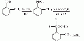 由鄰甲苯胺經重氮化、酯化、水解而得。