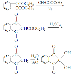 1.將苯二甲酸二乙酯與乙酸乙酯在金屬鈉存在下反應(yīng),生成苯并戊二酮甲酸乙酯,經(jīng)酸化失羧生成苯并戊二酮,再氧化生成水合茚三酮。