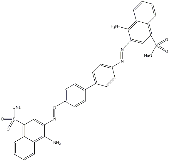 1.由聯(lián)歡苯胺重氮化后,與1,4-氨基萘磺酸鈉進(jìn)行偶合,而后經(jīng)鹽析;過濾及干燥而制得。具體操作為:取48.4g聯(lián)苯胺溶于300ml鹽酸(含濃鹽酸20ml)中,加冰冷至5℃以下,加30ml濃鹽酸后,加入由14.4g亞硝酸鈉配成的10%的水溶液。重氮化結(jié)束后,將重氮鹽溶液慢慢加入150g對氨基萘磺酸鈉和少量水配成的溶液中,放置半小時后,在充分?jǐn)嚢柘侣尤?5g碳酸鈉,使溶液呈堿性,加熱至約80℃后,冷卻,過濾,用飽和鹽水洗滌,干燥即得成品。