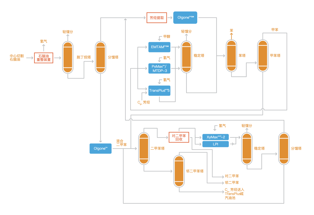 方法三:鉑重組法,用常壓蒸餾獲得的輕汽油(初餾點(diǎn)約138℃),提取大于65℃餾分,先經(jīng)過(guò)含鉬催化劑,催化加氫脫出有危害性的雜物,再經(jīng)過(guò)鉑催化劑開(kāi)展重組,用二乙二醇醚溶劑萃取,隨后再逐塔精餾,獲得苯、甲苯、二甲苯等生成物。