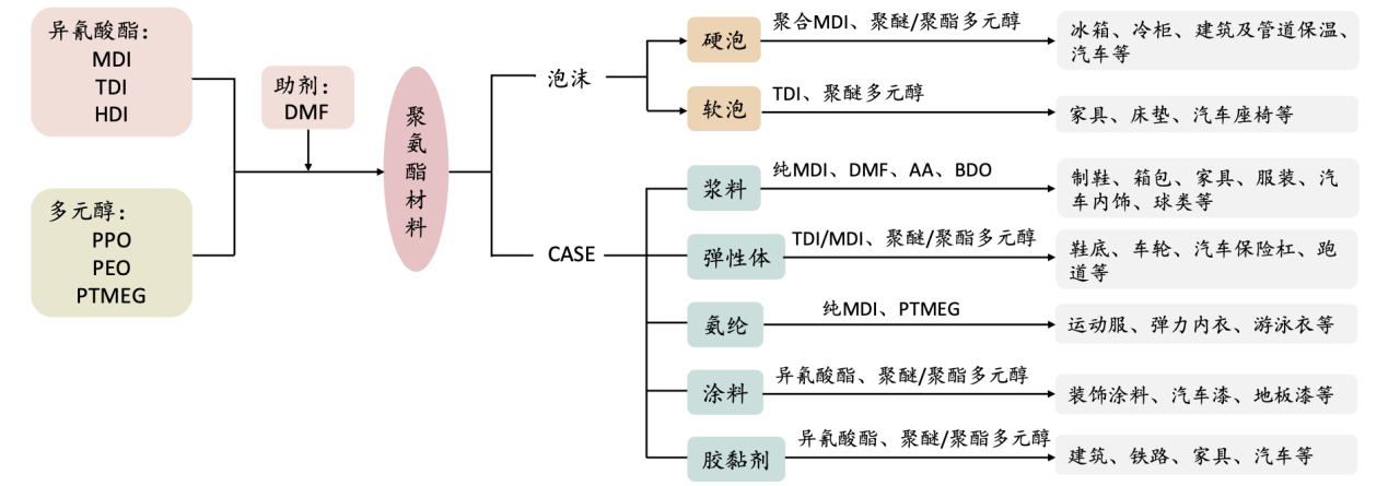 MDI 是生產聚氨酯最重要的原材料,而聚氨酯性能優(yōu)異,是繼聚乙烯、聚氯乙烯、聚丙烯、聚苯乙烯和 ABS 之后的第六大塑料,可以用于生產塑料、纖維、涂料、橡膠等產品,廣泛應用于國防、航天、輕工、化工、石油、紡織、交通、汽車、醫(yī)療等領域。
