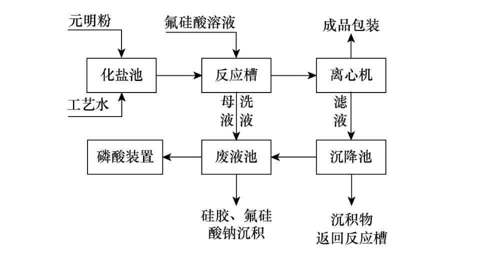 氯化鈉法是以工業(yè)級氯化鈉和氟硅酸為原料,生成氟硅酸鈉和鹽酸,氯化鈉法工藝流程較長,分為化鹽、化灰、反應(yīng)離心、中和、沉降、壓潓、包裝等工序,生產(chǎn)粗放,產(chǎn)生大量含氯廢水及廢渣,外排污染環(huán)境。