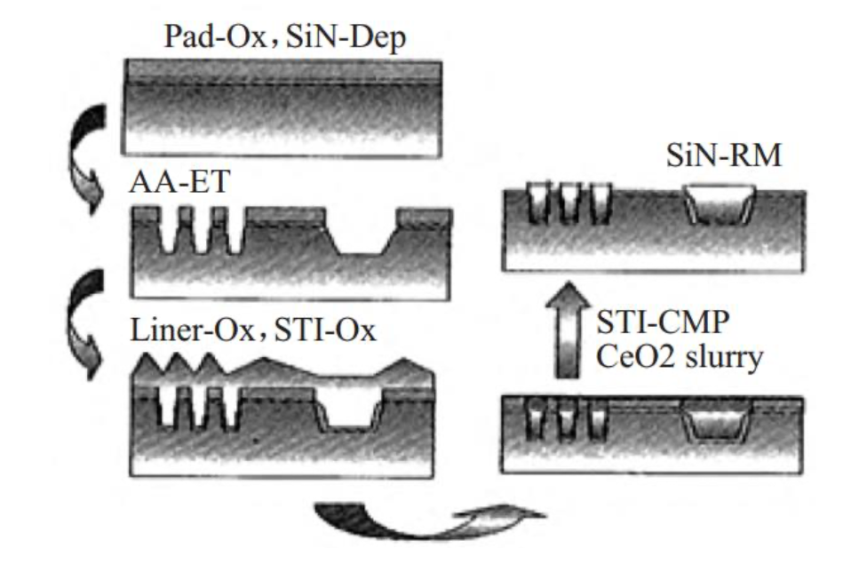 它是比較早被選用的CMP工藝,也是CMP在芯片制造中最基礎(chǔ)的應(yīng)用。直到現(xiàn)在,選用氧化鈰研磨液的拋光工藝依然是STICMP的主要方式 。