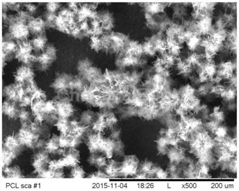 - 將濃度為0.12mol/L~0.24mol/L的氨水加入到硫酸鋅晶體的乙醇分散液中,攪拌均勻,再在室溫下放置5min~420min,再以去離子水為清洗劑,在離心速度為2000r/min~4000r/min下離心清洗3次~5次,得到氫氧化鋅,即為空心花狀氫氧化鋅。
