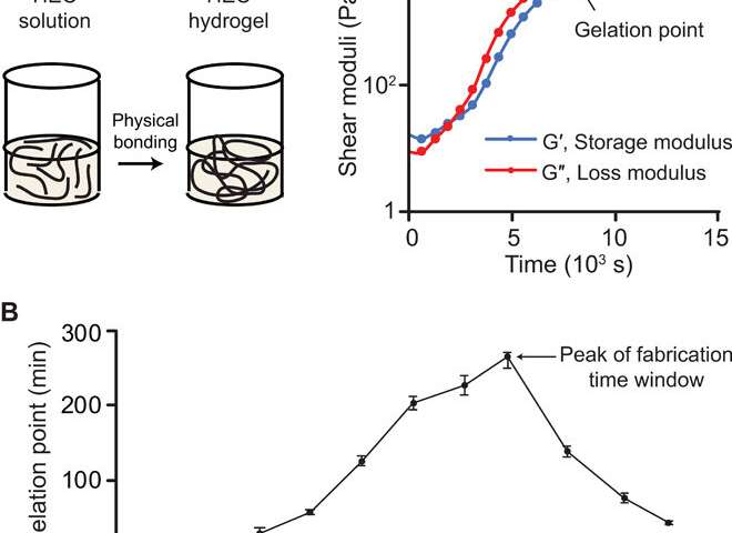 印刷溶液的流變性。(A)左側(cè)的示意圖顯示了由于物理粘合而導致的打印溶液的凝膠化。右邊的剪切模量與時間的關(guān)系圖顯示了在?5800 s處發(fā)生的膠凝點。按照慣例,膠凝點被定義為在HEC種類最初溶解之后儲能模量G’變得大于損耗模量G”的時間點。(B)示出了膠凝時間與印刷溶液的pH的函數(shù)關(guān)系的圖。通過添加不同量的CA來調(diào)節(jié)pH。誤差棒表示三個試驗的SD。該圖揭示了最高的膠凝點,因此最長的印刷時間窗口,在?3.0的pH值下發(fā)生。圖片來源:Science Advances,doi:10.1126 / sciadv.aay0929