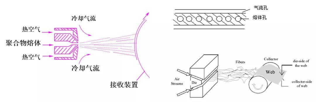 牽伸處理噴嘴孔模的原理熔融擠出的熱空氣的聚合物細流具有高的速度,從而形成上凝固和聚結(jié)鼓的超細纖維或網(wǎng)篩,依靠自身成為粘合無紡布原理紡絲如圖下面:
