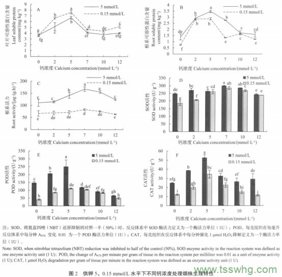 采用甲基百里香酚藍測定法定量檢測煙株根系中鈣離子含量,根據(jù)試劑盒使用步驟測定(試劑盒購自南京建成生物工程研究所)。