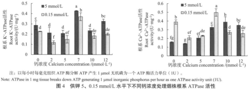 鉀是植物生長必需的營養(yǎng)元素,也是公認的煙草品質(zhì)元素,但我國植煙土壤供鉀不足及煙株鉀素利用率低等問題,嚴重影響著我國煙葉鉀含量。由于北方植煙土壤主要以2:1型黏土礦物為主,干濕交替頻繁,土壤中鈣含量較高;而南方施用石灰改良土壤酸堿度,增加了土壤鈣含量,導(dǎo)致土壤中Ca2+、K+等交換性陽離子比例失調(diào),煙草吸收鉀困難且煙葉鉀含量整體較低。因此研究鈣對煙草鉀吸收的影響,對提高煙葉鉀含量具有重要意義。植株鉀吸收與外界鈣濃度密切相關(guān)且關(guān)系十分復(fù)雜。有研究發(fā)現(xiàn),高鈣處理可以提高烤煙根系和煙葉的鉀含量,Ca2+可以防止細胞內(nèi)K+外滲,減少根系陽離子流失,有利于K+的吸收。然而也有研究表明,土壤有效鈣含量與煙葉鉀含量呈負相關(guān),鈣對鉀有一定的拮抗作用,Ca2+的存在會與K+競爭質(zhì)膜上的吸收通道,減少植株對鉀的吸收。目前關(guān)于外界鈣濃度對煙草鉀吸收的影響研究,多集中在正常鉀水平下且兩者關(guān)系并不十分明確。因此本文以煙草品種K326為研究材料,采用室內(nèi)水培的方法,通過對煙株進行兩種鉀水平和不同鈣濃度組合處理,探索低鉀脅迫下外界鈣濃度與煙草鉀吸收之間的關(guān)系,為鉀鈣平衡施肥提供依據(jù)。