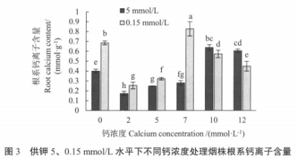 當煙苗長至3片真葉時,挑選長勢一致的煙苗,于蒸餾水中饑餓處理24h,再分別置于不同鉀和鈣濃度的營養(yǎng)液中培養(yǎng)12d后,取煙株地上部及根系進行指標測定。試驗共設(shè)12個處理,包括2個鉀水平,分別為常鉀(5mmol/L)和低鉀(0.15mmol/L),以及6個鈣濃度(0、2、5、7、10、12mmol/L)。試驗所用營養(yǎng)液根據(jù)Hoagland完全營養(yǎng)溶液改良而成,去除營養(yǎng)液配方中所有鈣離子,使用氯化鈣調(diào)節(jié)營養(yǎng)液中鈣濃度,調(diào)節(jié)pH至6.5。7.0。在培養(yǎng)過程中,使用充氣泵每El通氣2h,每4d更換一次營養(yǎng)液,以保持營養(yǎng)液的成分相對穩(wěn)定。每處理6個重復(fù)。