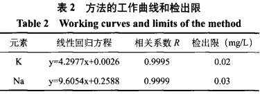 ICP-MS法測定水基膠中K、 Na含量采用在線加入內(nèi)標(biāo)的方法定量。將標(biāo)準工作溶液配制成濃度分別為0.5、1、5、10、 20、50、 100mg/L 的工作溶液,表2顯示了K、Na各元素的線性回歸方程、相關(guān)系數(shù)和檢出限。