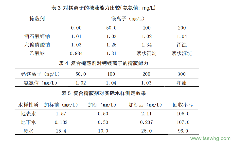 探討了實際水樣加入酒石酸鉀鈉溶液后產(chǎn)生白色沉淀的去除方式;研究了除國標外3種掩蔽劑的效果,并配制酒石酸鉀鈉-六偏磷酸鈉復(fù)合掩蔽劑,經(jīng)試驗掩蔽效果良好;對比加掩蔽劑與不加掩蔽劑兩種方式測得的氨氮曲線的差異,指出氨氮測定時無鈣鎂離子干擾可以不加掩蔽劑。