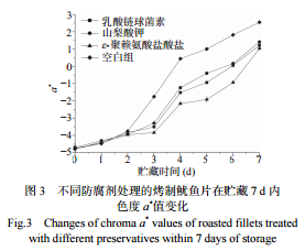 在不同保鮮劑處理下烤制魷魚片的色度a*值如圖3所示。隨著貯藏時間的增長,這3種不同防腐劑處理的烤制魷魚片和空白組烤制魷魚片的a*值呈現(xiàn)上升的趨勢。在整個貯藏過程中,在貯藏的第0~2d,3種不同防腐劑處理的烤制魷魚片的a*值無顯著性差異;第3~7d時4組烤制魷魚片的a*值均存在顯著性差異,其中空白組烤制魷魚片的a*值增長速度最快,其次是山梨酸鉀處理組和乳酸鏈球菌素處理組,ε-聚賴氨酸鹽處理組烤制魷魚片的a*值增長速度最慢,可能的原因是ε-聚賴氨酸鹽抑制烤魷魚片中高鐵肌紅蛋白的生成,這與田光娟等人研究結(jié)果一致。所以本實驗中ε-聚賴氨酸鹽可以更好的減緩烤制魷魚片a*值的上升。