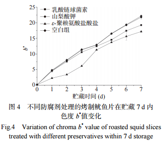 在不同防腐劑處理下烤制魷魚片的色度b*值如圖4所示。由圖4可知,隨著貯藏時間的增長,使用3種不同防腐劑處理的烤制魷魚和空白組烤制魷魚的b*值呈現(xiàn)上升的趨勢,這表明魷魚隨著貯藏期的延長,魷魚肉有發(fā)黃的趨勢。黃卉等人認為隨著貯藏期的延長,在光線、溫度、酶等引發(fā)劑的作用下魚肉脂肪逐漸被氧化,使得肉逐漸變黃。0d時,4組烤制魷魚的b*值無顯著性差異,說明烤制魷魚片的脂質(zhì)氧化與腐敗程度對肌肉的顏色影響顯著,各種防腐劑能有效及控制魷魚肌肉中的蛋白質(zhì)分解。在貯藏的1~7d,ε-聚賴氨酸鹽處理組烤制魷魚的b*值均顯著低于其他3組,可能的原因是ε-聚賴氨酸鹽阻止了烤制魷魚組織中的脂質(zhì)過氧化,又由于ε-聚賴氨酸鹽能防止食品褐變,所以ε-聚賴氨酸鹽可以更好的減緩烤制魷魚b*值的上升。在本實驗中經(jīng)ε-聚賴氨酸鹽組處理的烤制魷魚片的b*值的變化速度要明顯低于其他組。