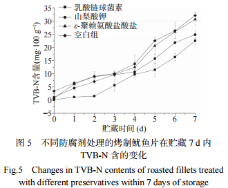 食品的pH能反映食品的酸堿性,也是評價食品品質(zhì)的一個重要指標。通過檢測食品的pH,可以確保食品的品質(zhì)并且能增加食品的穩(wěn)定性,從而延長食品的保質(zhì)期。由圖1可知,使用3種不同防腐劑處理的烤制魷魚和空白組烤制魷魚的pH隨著貯藏時間的增長呈現(xiàn)上升的趨勢。0~2d時,ε-聚賴氨酸鹽處理組、山梨酸鉀處理組和空白組烤制魷魚的pH無顯著性差異;第3~7d時,空白組和ε-聚賴氨酸鹽處理組烤制魷魚的pH明顯高于山梨酸鉀處理組,可能與此時期TVB-N含量的上升有關(guān),TVB-N的本質(zhì)主要是蛋白質(zhì)分解產(chǎn)生的氨以及胺類等堿性含氮物質(zhì),由此可見是因為空白組和ε-聚賴氨酸鹽處理組烤制魷魚的蛋白質(zhì)分解導致TVB-N含量的上升從而導致pH升高。在整個貯藏過程中,Nisin處理的烤制魷魚的pH始終明顯低于ε-聚賴氨酸鹽處理組、山梨酸鉀處理組和空白組,這是因為Nisin本身呈酸性,其可以降低周圍介質(zhì)的pH,這是Nisin處理組pH始終明顯低于其他3組的主要原因。在整個貯藏期間,使用Nisin、山梨酸鉀、ε-聚賴氨酸鹽處理的烤制魷魚與空白組烤制魷魚的pH變化差值分別為0.43、0.50、0.70、0.79,由此可見,與其他組相比,Nisin處理的烤制魷魚在貯藏過程中pH變化最小,因此Nisin能有效減緩烤制魷魚pH的變化。
