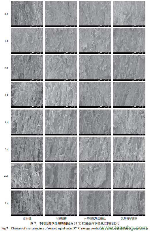 圖7為3種不同防腐劑處理及空白組烤制魷魚在貯藏過程中的微觀結(jié)構(gòu)的變化。橫排從左至右依次為空白組、山梨酸鉀處理組、ε-聚賴氨酸鹽處理組以及Nisin處理組,縱列從上至下依次為貯藏0、1、2、3、4、5、6、7d的烤制魷魚。0d時(shí)的烤制魷魚,結(jié)構(gòu)較完整,整體結(jié)構(gòu)趨于緊密,肌纖維致密均勻,纖維之間基本觀察不到明顯的間隙;但空白組的烤制魷魚斷面不干脆,凹凸不平;而3種不同防腐劑處理的烤制魷魚斷面較為平整;但4組樣品斷面的表面均能觀察到一些斷開的較零散的肌原纖維,可能是制樣時(shí)采取掰斷的操作所致。貯藏1~2d時(shí),4組烤制魷魚的肌纖維都出現(xiàn)了不同程度劣變,肌纖維之間可以觀察到不明顯的間隙,但空白組的烤制魷魚在2d時(shí)肌纖維間出現(xiàn)了較為明顯的間隙。貯藏3~5d時(shí),空白組烤制魷魚的的肌纖維間隙逐漸變大,肌纖維出現(xiàn)了斷裂、分離以及扭曲的現(xiàn)象;山梨酸鉀處理組和ε-聚賴氨酸鹽處理組的烤制魷魚也出現(xiàn)了肌纖維斷裂及分離的現(xiàn)象,且第5d時(shí)可以觀察到肌纖維間明顯的間隙;Nisin處理組的烤制魷魚也可觀察到肌纖維間存在明顯的間隙,但觀察不到明顯的肌纖維斷裂現(xiàn)象。貯藏6~7d時(shí),空白組的烤制魷魚劣變嚴(yán)重,肌纖維結(jié)構(gòu)混亂,斷裂的現(xiàn)象十分嚴(yán)重;山梨酸鉀處理組和ε-聚賴氨酸鹽處理組烤制魷魚的肌纖維間出現(xiàn)嚴(yán)重的分離現(xiàn)象,且肌纖維間間隙較大,7d時(shí)山梨酸鉀處理組的烤制魷魚的肌纖維也出現(xiàn)嚴(yán)重的斷裂現(xiàn)象;Nisin處理組烤制魷魚的肌纖維可觀察到輕微的斷裂現(xiàn)象,肌纖維間間隙也略有增大,但與其他組相比,Nisin處理組烤制魷魚的微觀結(jié)構(gòu)較為完整。魷魚是典型的高蛋白生物,其肌纖維的主要成分為蛋白質(zhì),所以其微觀結(jié)構(gòu)發(fā)生變化的主要原因是蛋白質(zhì)受到破壞。魷魚內(nèi)源酶或微生物的作用可使蛋白質(zhì)分解被破壞,但魷魚經(jīng)過高溫烤制后,大部分內(nèi)源酶被高溫破壞失去活性,所以本實(shí)驗(yàn)中烤制魷魚蛋白質(zhì)被破壞主要與微生物的作用有關(guān),中烤制魷魚貯藏過程中菌落總數(shù)、TVB-N含量和pH的變化情況能證實(shí)這一點(diǎn),且烤制魷魚的菌落總數(shù)、TVB-N含量和pH的變化結(jié)果與烤制魷魚微觀結(jié)構(gòu)變化情況基本一致。