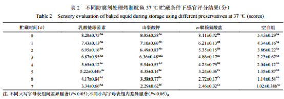 產(chǎn)品在貯藏期間品質(zhì)的變化可以用感官評(píng)分直觀地反映出來。從表2可以看出,在貯藏第1d時(shí),乳酸鏈球菌素組、山梨酸鉀組、ε-聚賴氨酸鹽組的感官評(píng)分相近,隨著貯藏時(shí)間延長(zhǎng),各組樣品的感官品質(zhì)均逐漸下降,但下降幅度不盡相同。對(duì)照組的感官得分下降最快,貯藏第3d時(shí),對(duì)照組的感官評(píng)分下降至2.23分,產(chǎn)品出現(xiàn)異味,色澤變化較大,感官不能接受,表明產(chǎn)品開始腐敗變質(zhì)。這可能是因?yàn)榈鞍踪|(zhì)貯藏過程中,蛋白質(zhì)和醛類相互作用導(dǎo)致蛋白質(zhì)變性和聚集,使肉制品發(fā)生品質(zhì)的變化。肉中脂肪發(fā)生氧化時(shí),肉中的多不飽和脂肪酸、色素、脂溶性維生素減少,產(chǎn)生酸敗味,從而影響肉制品的品質(zhì)。而同一時(shí)間乳酸鏈球菌素處理的烤制魷魚的色澤、外觀、氣味及總體可接受性仍較好。山梨酸鉀處理的烤制魷魚在貯藏第6d達(dá)到不可接受范圍;ε-聚賴氨酸鹽組處理的烤制魷魚的感官得分在貯藏第5d達(dá)到不可接受范圍??梢?,乳酸鏈球菌素能在一定程度上延緩烤制魷魚感官品質(zhì)下降,較好的保持烤制魷魚的品質(zhì)。