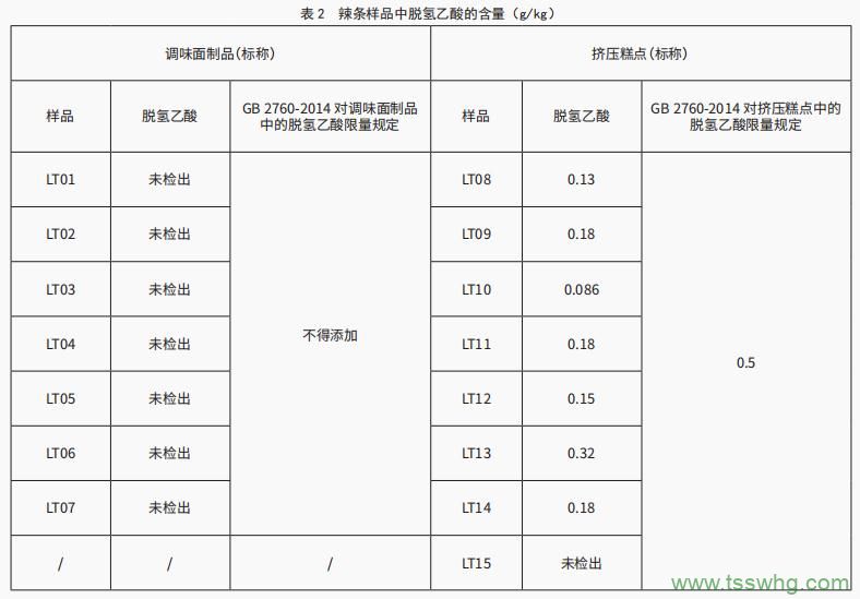 從表2可知,標(biāo)稱為“調(diào)味面制品”的辣條中均未檢出脫氫乙酸,但標(biāo)稱為“擠壓糕點(diǎn)”的辣條中普遍檢出了脫氫乙酸,其含量雖然未超出GB2760-2014標(biāo)準(zhǔn)對(duì)糕點(diǎn)中脫氫乙酸的限量要求,但是辣條類食品若按現(xiàn)行規(guī)定以“調(diào)味面制品”來(lái)進(jìn)行管理,樣品LT08、LT09、LT10、LT11、LT12、LT13和LT14都屬于超范圍添加食品添加劑的不合格食品。