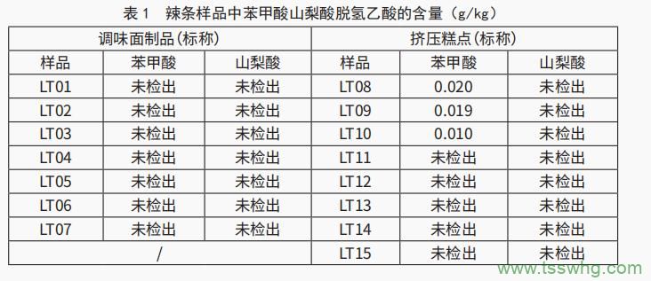 15個(gè)辣條樣品中,有7個(gè)是標(biāo)稱為“調(diào)味面制品”的辣條,8個(gè)是標(biāo)稱為“擠壓糕點(diǎn)”的辣條,這些辣條中的苯甲酸、山梨酸的測(cè)定結(jié)果見(jiàn)表1。