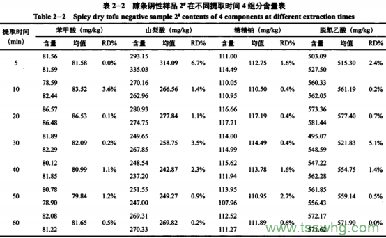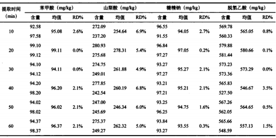 參考國標GB5009:28-2016一般性食品中樣品提取時間,本試驗對不同類別的糕點進行加標試驗來考察樣品提取時間對目標成分提取效率的影響,考察的提取時間分別為5min、10min、20min、30min、40min、50min、60min,稱取糕點、月餅、辣條樣品各3份,精密加入混合標準使用液2.0mL,上機測定,得到4組分在不同提取時間的含量,結果見表2。結果顯示,超聲提取10min,4種目標組分的數值基本達到穩(wěn)定,提取時間為20min所得含量最高,本次試驗最終選擇超聲時間為20min。