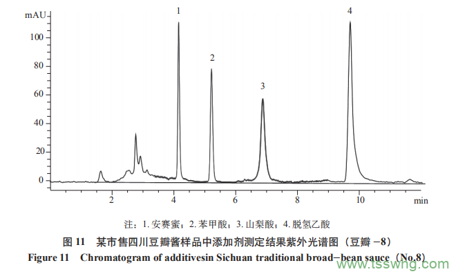 流動(dòng)相的流速主要影響溶質(zhì)與固定相和流動(dòng)相的相互作用,從而改變待測組分的保留時(shí)間及各組分之間的分離度。流速過快,可能導(dǎo)致色譜柱壓升高,系統(tǒng)壓力過高導(dǎo)致漏液;流速過慢則會(huì)延長待測物的保留時(shí)間,引起色譜峰拖尾,所以在實(shí)驗(yàn)過程中要選擇合適的流速。實(shí)驗(yàn)結(jié)果表明:當(dāng)流動(dòng)相流速為 1.0mL/min 時(shí),五種添加劑雖然出峰良好,但山梨酸和糖精鈉的保留時(shí)間比較接近,可能導(dǎo)致積分誤差;而當(dāng)流速為 0.9mL/min時(shí),五種添加劑可以完全分離,各組分出峰效果較好,出峰順序分別為:安賽蜜、苯甲酸、山梨酸、糖精鈉、脫氫乙酸(見圖 9 ~ 10);綜上所述,實(shí)驗(yàn)選擇檢測波長為 230nm,流動(dòng)相體系為甲醇 – 乙酸銨,流動(dòng)相比例為 5∶95,流速為 0.9mL/min,進(jìn)行下一步實(shí)驗(yàn)。